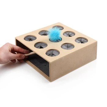 Die neue interaktive Spielbox mit extra großen Löchern ist ideal für Katzen aller Art. Die Spielbox ist aus stabilem, ungiftigen und umweltfreundlichen Holz gefertigt und bietet durch die qualitative Verarbeitung langen Spielspaß. Durch bewegen des mitgelieferten Spielstabs in der Box wird der Jagdinstinkt Ihres Stubentigers geweckt und gefördert. Die verschiedenen Einfräsungen der Löcher sorgen für ausreichend Abwechslung. Auf der einen Seite ist ein Pfotenmotiv eingefräst, auf der anderen wird es spannend mit neun eingefrästen Schlupflöchern. Der Spielstab ist mit einer Plüschmaus mit Federschwanz versehen und regt den Spieltrieb an.
