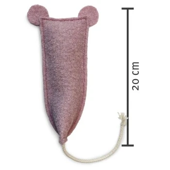 Die Maus besteht aus reiner Schurwolle und ist mit knisterndem Dinkelspelz gefüllt und herrlich duftendem Baldrian.