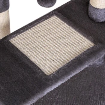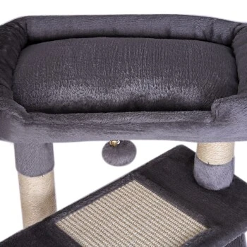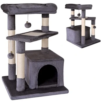 Mit diesem Katzenspielhaus aus weichem Plüsch bleiben keine Wünsche Ihrer Samtpfote offen. Die kuschelige Höhle lädt zum Ausruhen und Verstecken ein und die hängenden Plüschbälle sorgen für den nötigen Spielspaß. Das einladende Liegebett ist ideal für die Ruhezeiten und das Beobachten der Umgebung. Die Stämme aus robustem Sisal unterstützen die Krallenpflege und halten Ihre Katze somit von den Möbeln fern. Zusätzlich wurde eine Sisalfläche auf dem mittleren Plateau geschaffen.